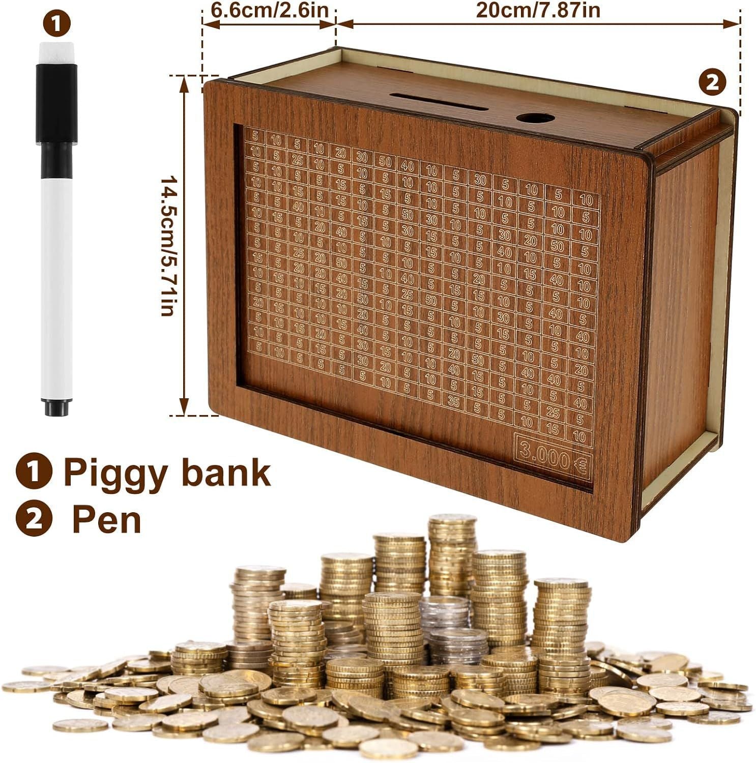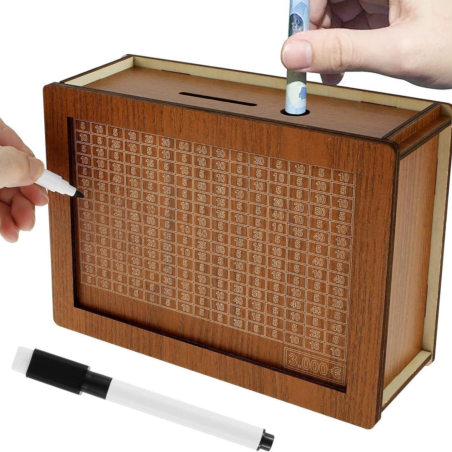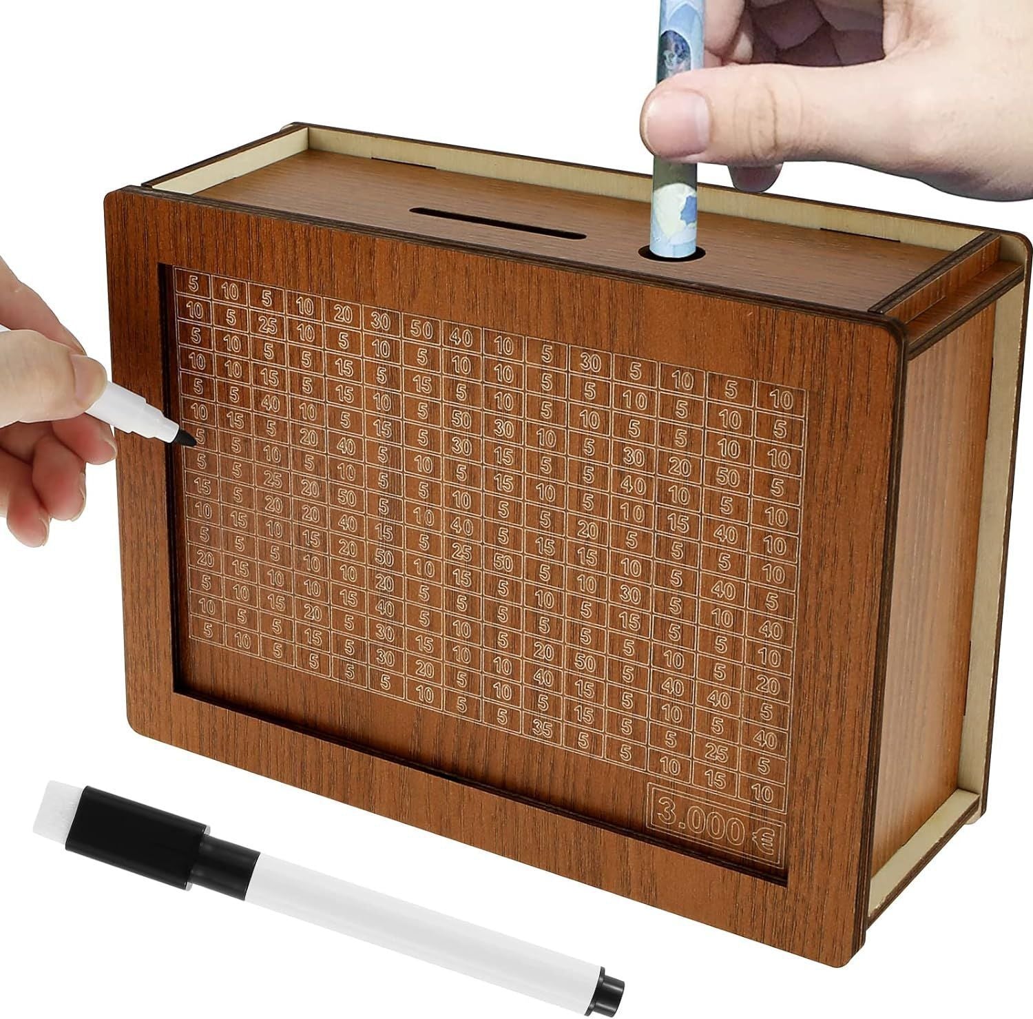 This money-saving box uses the method, where you can track your savings by attaching paper with the amount you want to save. With a goal capacity of $10,000, it provides a visual and motivating way to track your financial progress as you mark off each deposit.
